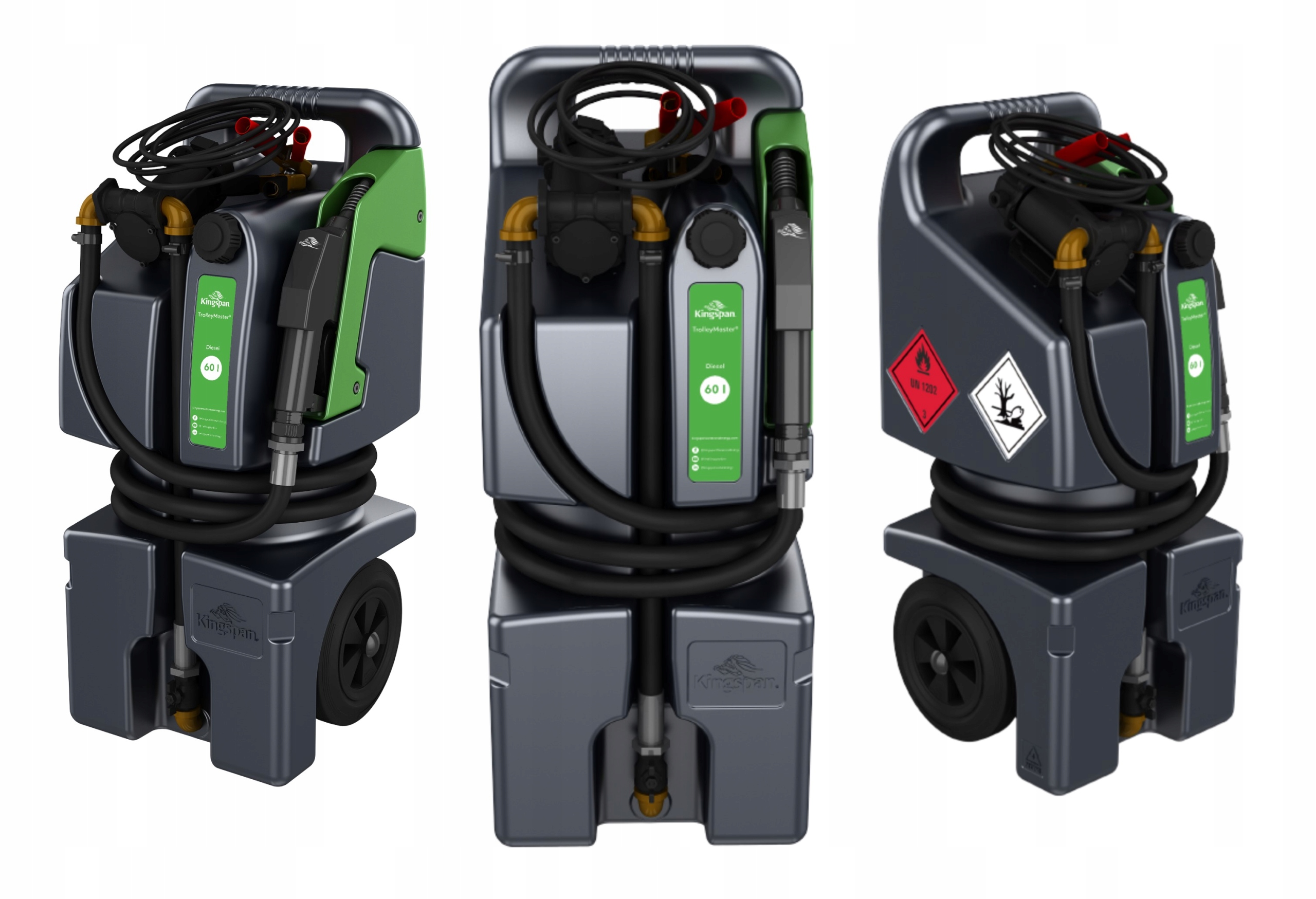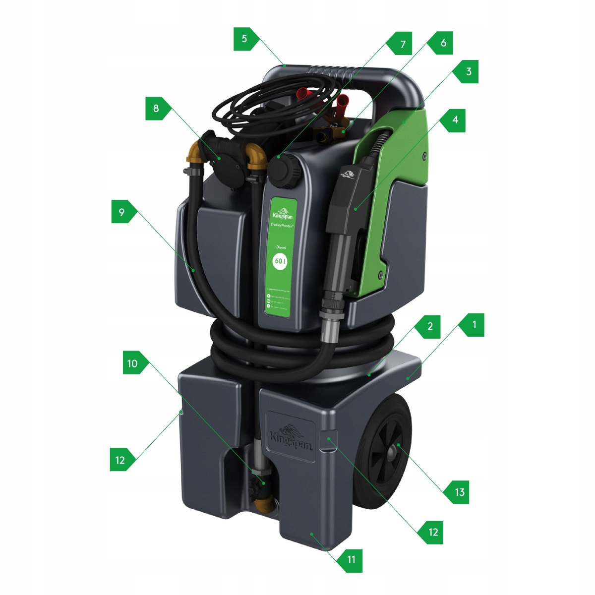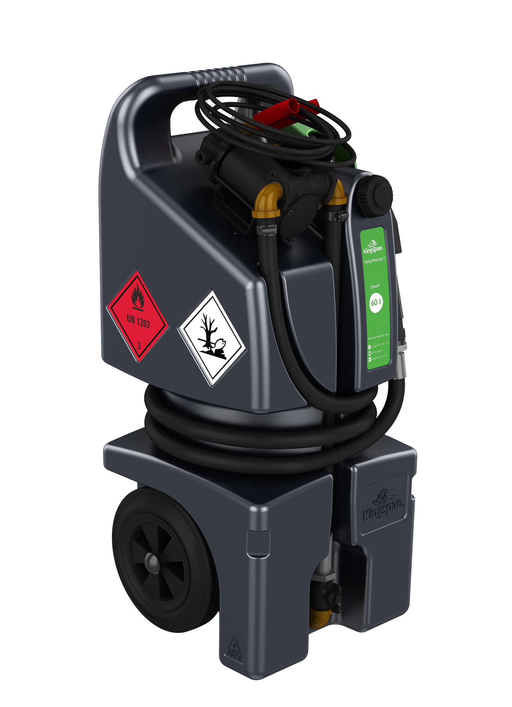 Mobilny zbiornik TrolleyMaster na olej napędowy Kingspan to kompaktowe i bezpieczne urządzenie do przechowywania i dystrybucji oleju napędowego. Posiada zamykany zawór kulowy, który zapobiega wyciekom, oraz kieszeń nalewaka, która zbiera skropliny i chroni zbiornik podczas transportu. Zbiornik wyprodukowany w Polsce