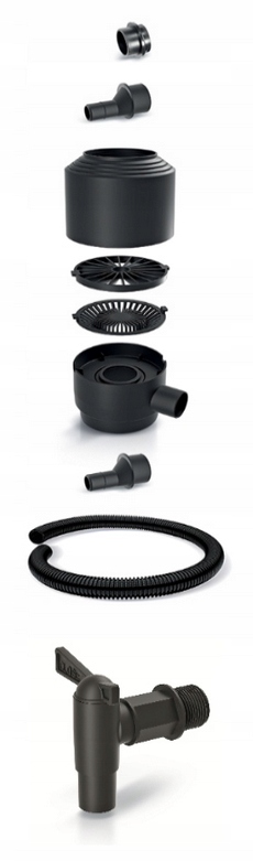 Zestaw instalacyjny obejmuje specjalnie zaprojektowany filtr, który usuwa liście z opadów deszczu, zapewniając czystą deszczówkę w zbiorniku. Dzięki temu woda jest gotowa do wykorzystania w różnych celach, takich jak podlewanie ogrodu, mycie samochodu.